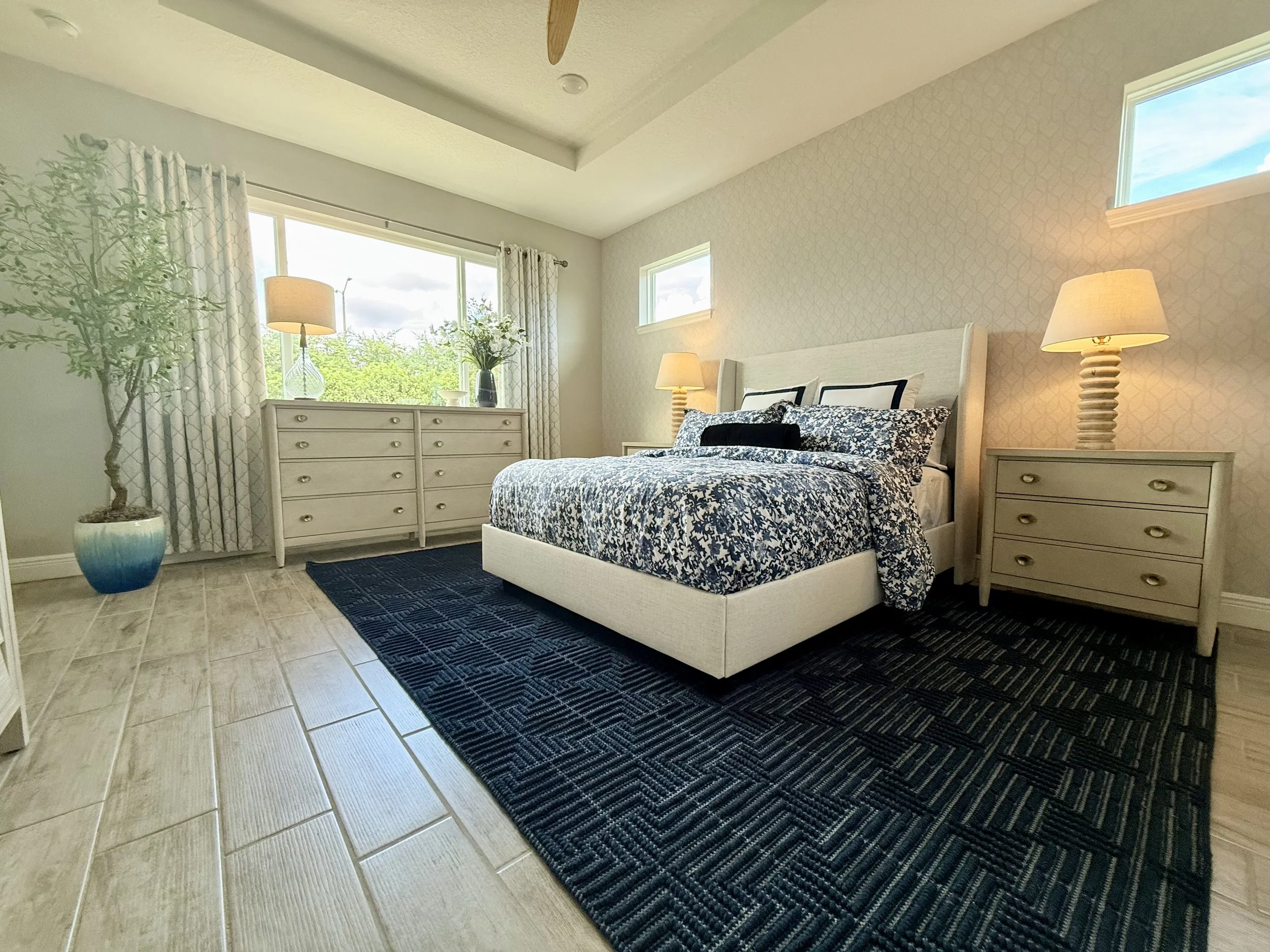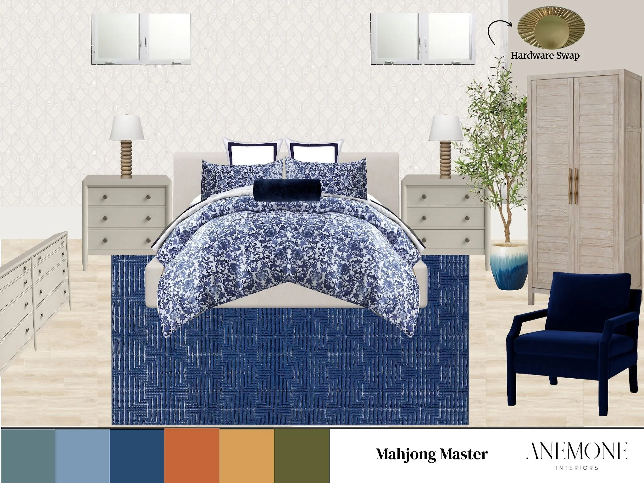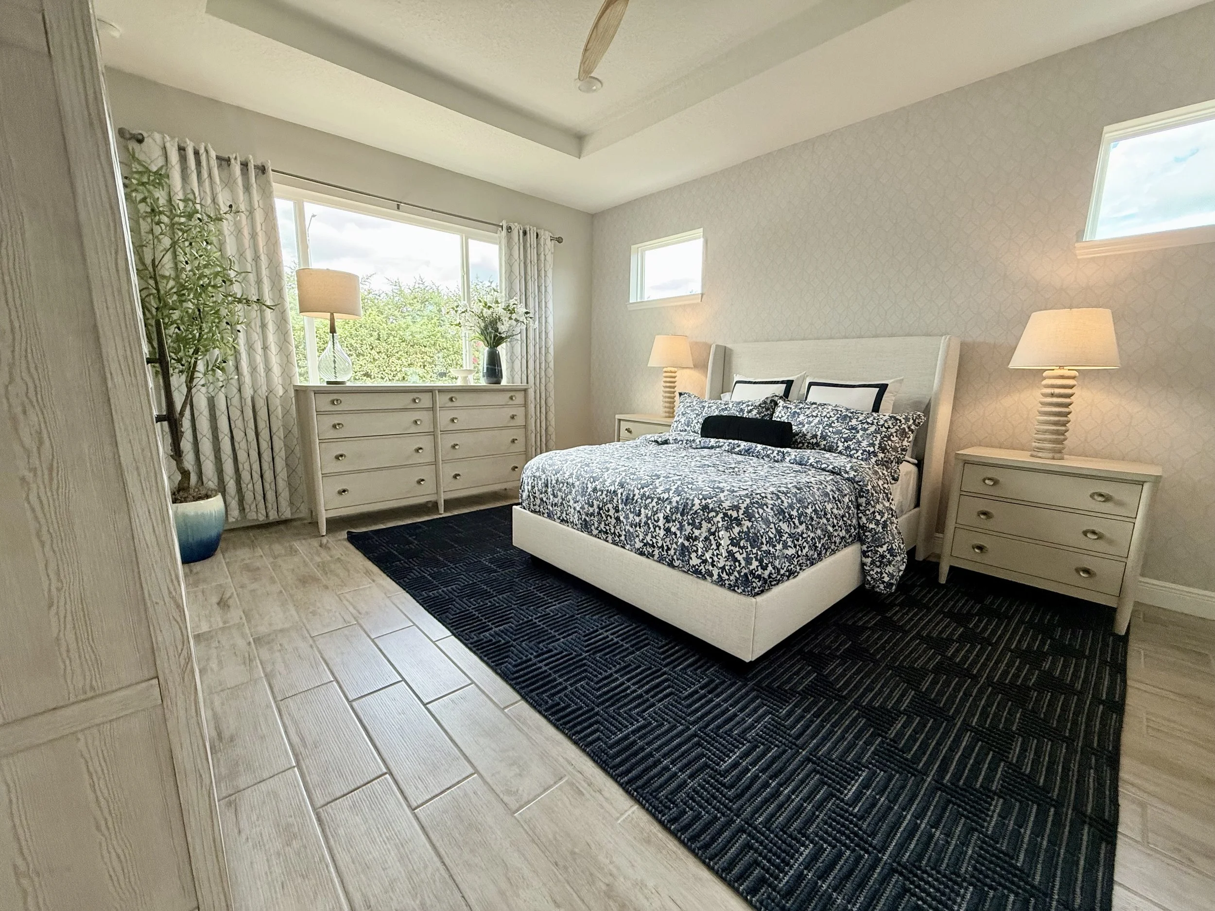 Layered & Livable: A Serene Florida Bedroom with Bold Navy Accents