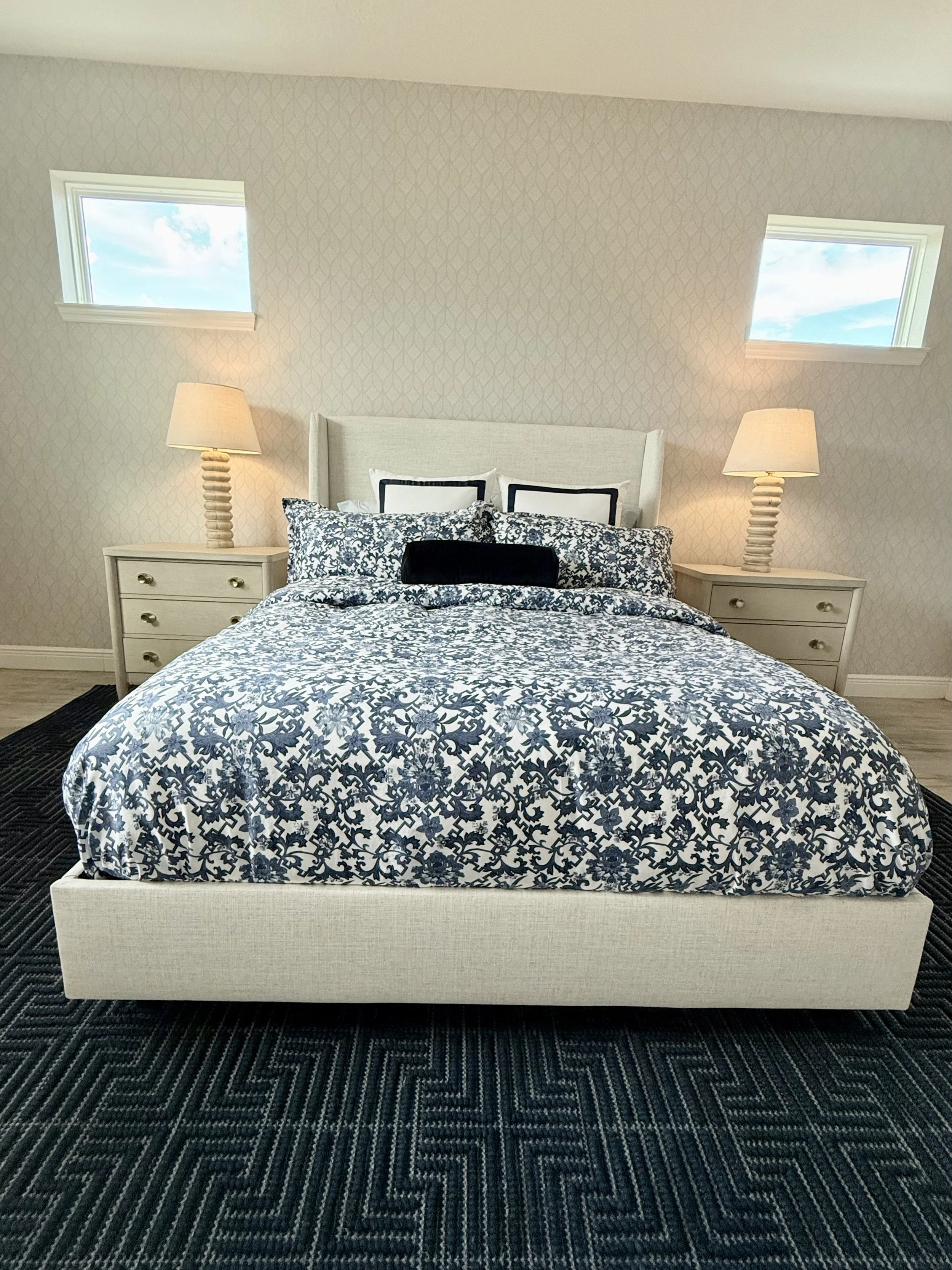 The bed itself is a clean-lined upholstered frame in a pale linen blend, paired with crisp navy-and-white bedding that feels fresh yet timeless. We layered in multiple patterns to keep things interesting without overwhelming the senses.